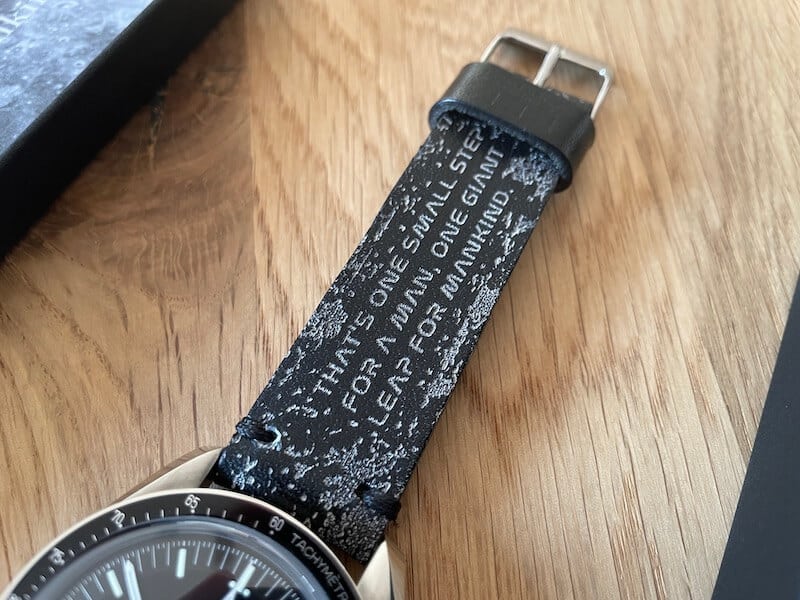 Konkret geht es um die grauen und mit Laser ins Lederband eingravierten Vertiefungen, zum Beispiel bei der Mondlandschaft, Neil Armstrongs Fußabdruck oder seinem legendären Funkspruch, bevor er als erster Mensch den Mond betreten hat.