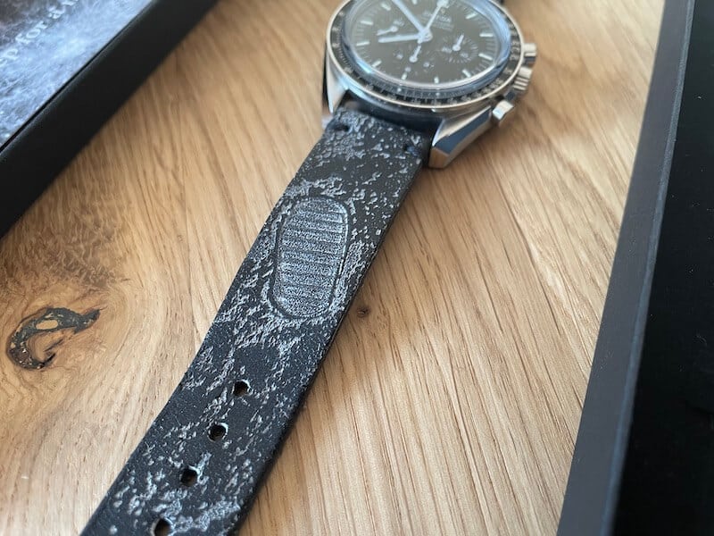 Preislich liegt das Moon DNA mit 170 Euro im bezahlbaren Bereich für ein handgemachtes Lederband mit schicker und hochwertiger Dornschließe, das in seiner Farbe Mond-Partikel enthält und designtechnisch kaum besser zur Moonwatch passen könnte. Auf der anderen Seite macht es die Moonwatch aber auch sportlicher und weniger auffällig.